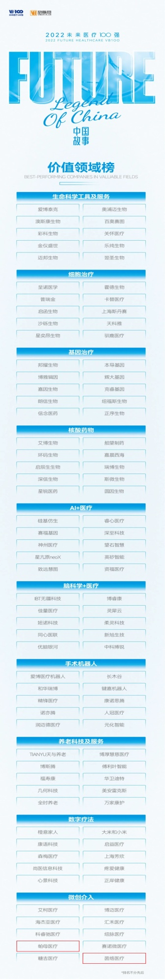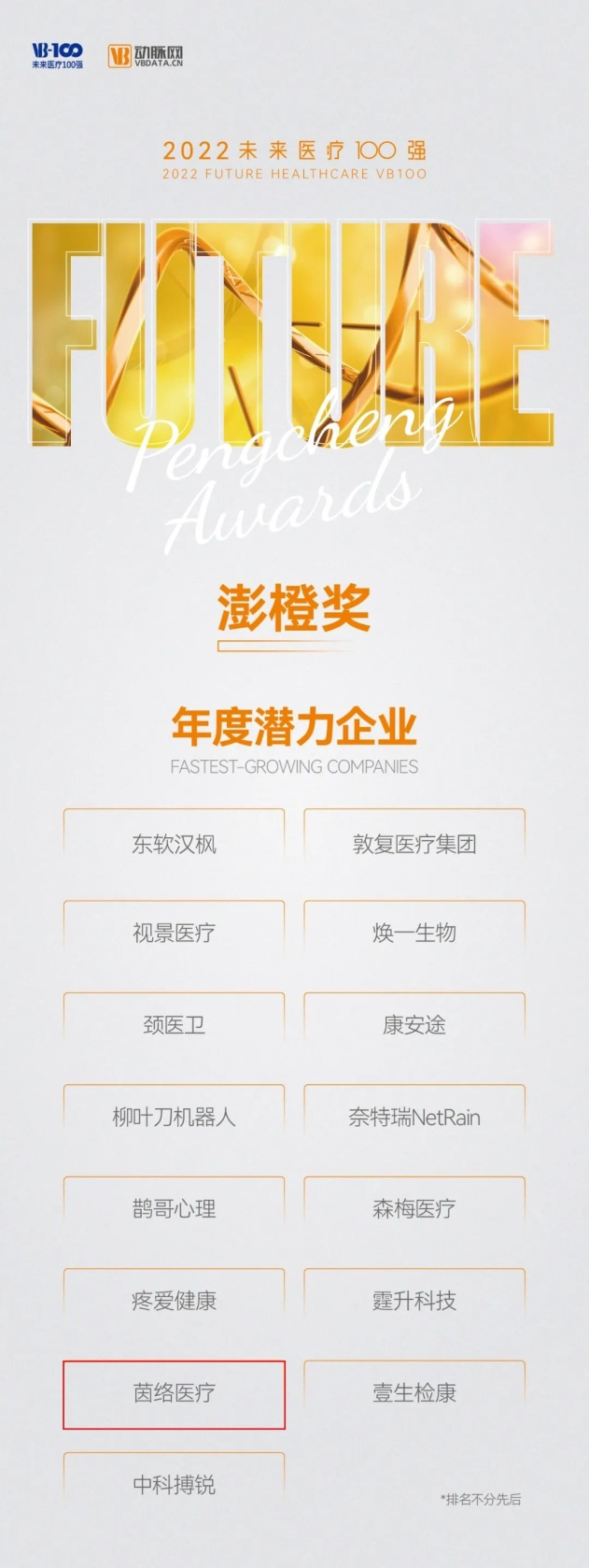 未來醫(yī)療100強(qiáng)榜是由VB100、動(dòng)脈網(wǎng)、蛋殼研究院推出的國內(nèi)第一個(gè)針對(duì)非上市企業(yè)的創(chuàng)新醫(yī)療領(lǐng)域榜單;創(chuàng)辦七年來,致力于遴選真正代表未來醫(yī)療的中國創(chuàng)新醫(yī)療者,發(fā)現(xiàn)我國未來醫(yī)療產(chǎn)業(yè)的核心力量,推動(dòng)健康醫(yī)療產(chǎn)業(yè)的創(chuàng)新變革進(jìn)程。2022未來醫(yī)療100強(qiáng)系列榜單下設(shè)中國創(chuàng)新醫(yī)療器械榜、中國創(chuàng)新醫(yī)療服務(wù)榜、中國創(chuàng)新數(shù)字醫(yī)療榜和中國創(chuàng)新生物醫(yī)藥榜四大主榜,價(jià)值領(lǐng)域榜、上市企業(yè)創(chuàng)新力排行榜以及澎橙獎(jiǎng)、蔚瀾?yīng)剝纱螵?jiǎng)項(xiàng)。