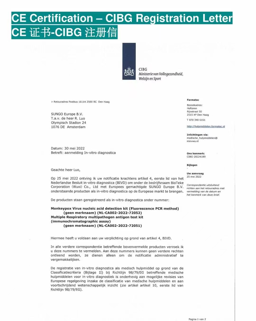 5月20日,百泰克生物再傳喜訊,公司緊急開(kāi)發(fā)的猴痘核酸檢測(cè)試劑盒獲得CE注冊(cè),成為江蘇首批12個(gè)廠家之一、無(wú)錫唯一可出口歐盟助力海外猴痘病毒防治的產(chǎn)品。