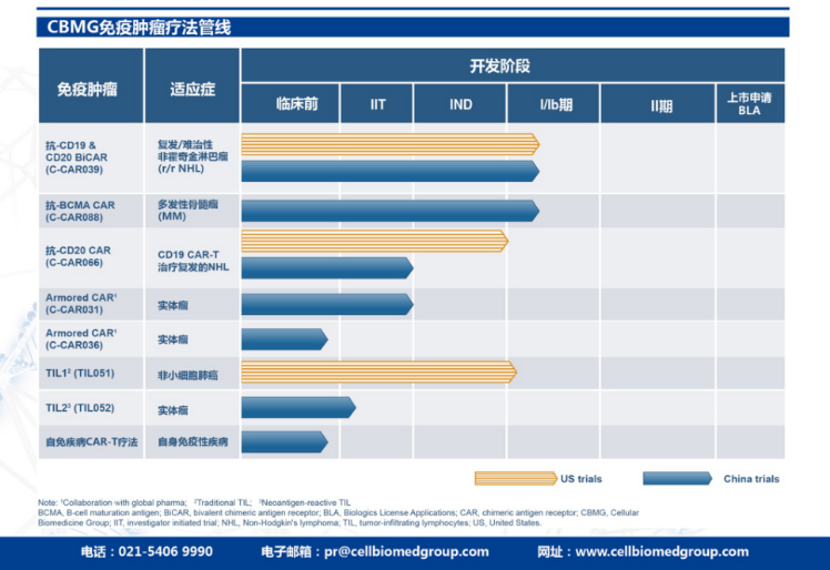 目前,CBMG臨床階段的血液腫瘤產(chǎn)品包括具有潛在同類最佳的靶向CD19/CD20新型雙靶點(diǎn)自體CAR-T細(xì)胞產(chǎn)品C-CAR039、靶向CD20的新型自體CAR-T細(xì)胞產(chǎn)品C-CAR066以及特異性靶向B細(xì)胞成熟抗原 (BCMA)的新型自體CAR-T細(xì)胞產(chǎn)品C-CAR088;實(shí)體瘤療法細(xì)胞治療產(chǎn)品包括自體鎧裝抗肝癌特異性抗原GPC3 CAR-T細(xì)胞產(chǎn)品C-CAR031以及腫瘤浸潤T淋巴細(xì)胞(TIL)治療產(chǎn)品C-TIL051。此外,還擁有多款新型針對血液腫瘤、實(shí)體瘤和自身免疫性疾病的臨床前細(xì)胞產(chǎn)品。